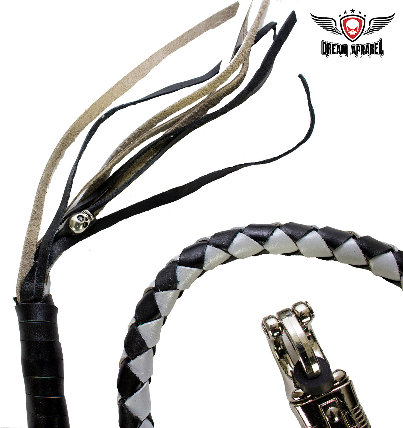 Back in the day, get back whips were used by bikers to let people know what club they belonged to and, when released from the handlebar, could be used as an actual whip. Today, bikers are able to use them to add a fantastic vintage look to their rides. Dream Apparel’s beautiful new 42″ Black and silver hand-braided leather get back whip with a stainless steel quick-release clip woven to it is a perfect addition to any and every bikers collection. Tightly wrapped at the end with Black leather, with Black and silver threaded fringe and a single silver skull tied to one of the fringes, our decorative get back whips are a great accessory and a fun way to make yourself more visible on